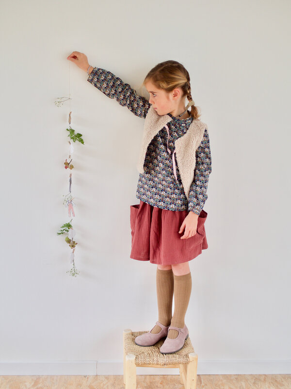 Celestine porte une blouse, une jupe et un gilet Apaches