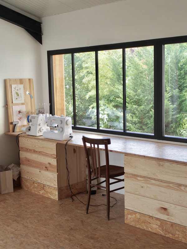 Quel bel atelier avec de jolis meubles en bois ! J’aimerais avoir le même… Vous n’avez pas fini de faire de magnifiques créations dans un lieu aussi agréable.