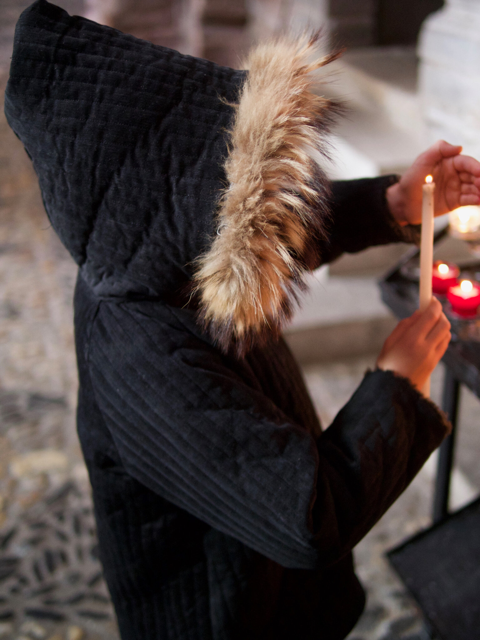 d’une veste en velours matelassé gris,