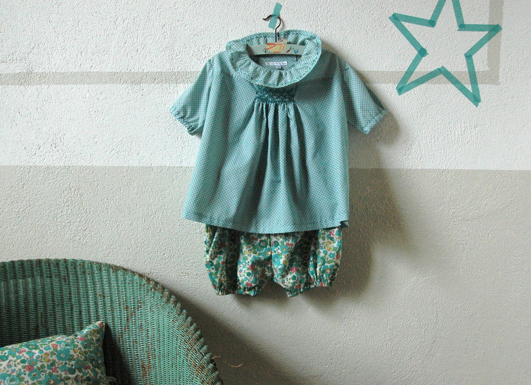 Vert, bleu de nouance très douces et une blouse amoureuse pour le printemps enfantine…bisous.